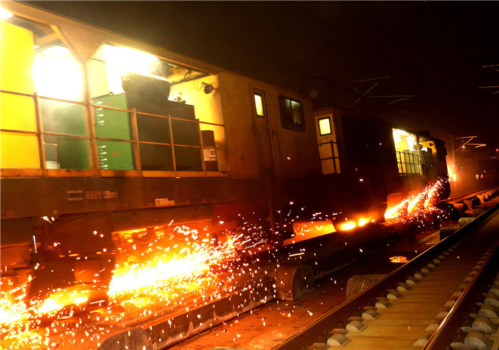 ↑1月9日,正在进行钢轨打磨作业的打磨车下火花四溅。 新华社记者 方喆 摄