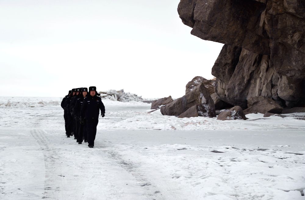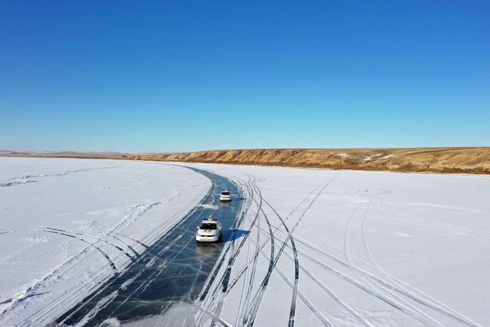 ↑1月22日,呼伦贝尔市公安局呼伦湖国家级自然保护区分局西岸联勤所民警在结冰的呼伦湖上巡逻。