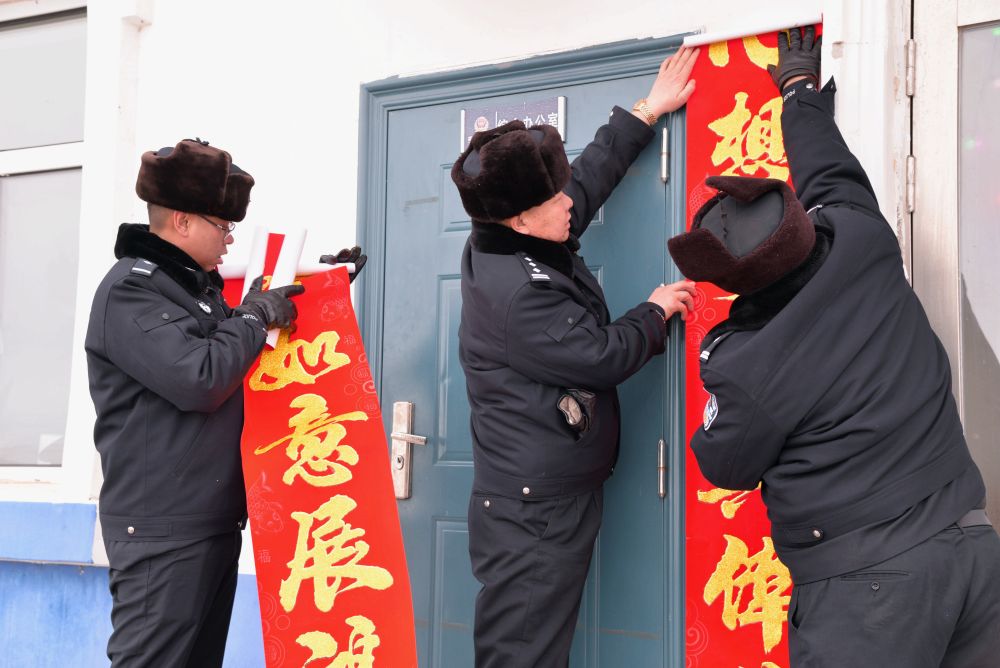 ↑1月22日,呼伦贝尔市公安局呼伦湖国家级自然保护区分局西岸联勤所民警在办公室外张贴春联。