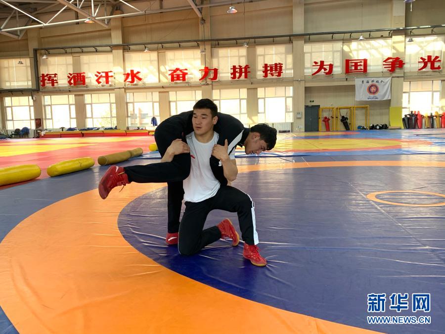 2月24日,在多巴基地,青海体工一大队摔跤队队员嘎朝拉(前)和队友在训练中。新华社记者 李琳海 摄