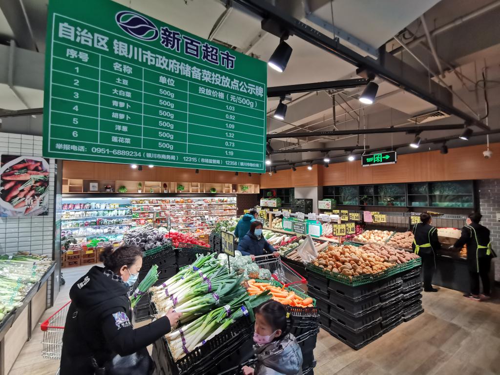 大白菜每斤0.92元、土豆每斤1.03元、鲜羊肉每斤34元……在宁夏回族自治区银川市新百连超老大楼店,绿色的公示牌上明确标示着政府储备肉菜价格。顾客们推着购物车穿梭在货架之间,不时停下来买块肉,或是挑拣蔬菜。看到哪个货架上的货物少了,超市工作人员便会手脚麻利地补货。