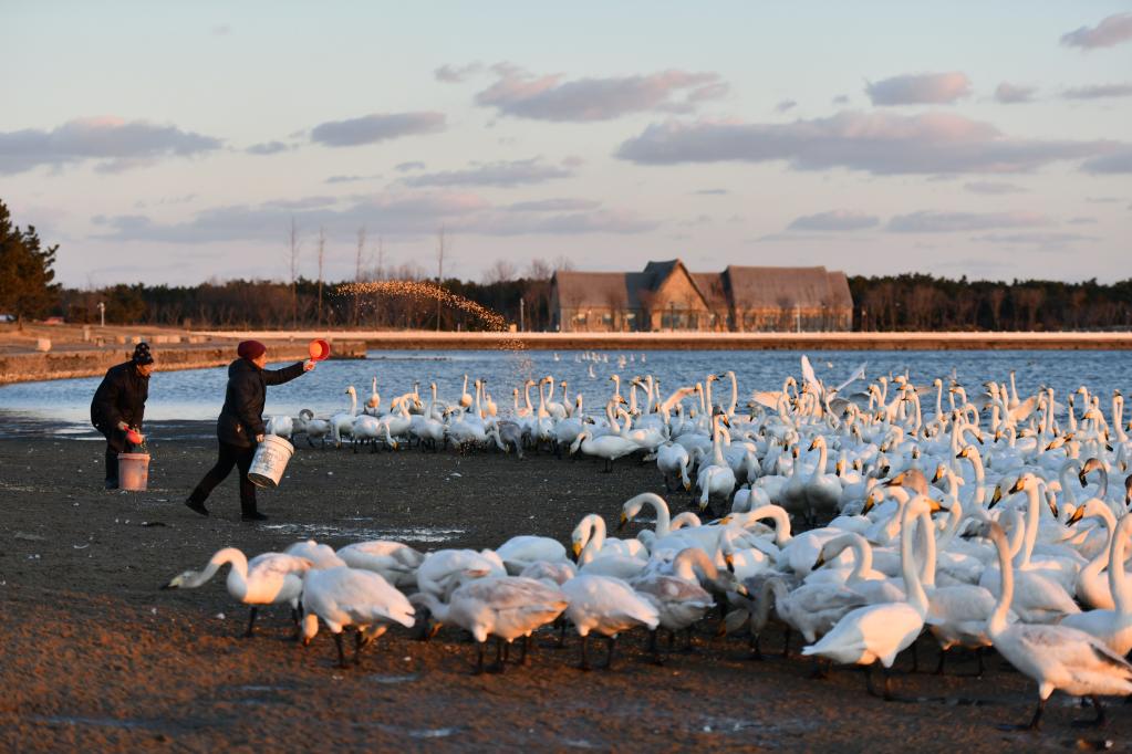 1月17日,刘志斌和老伴赵淑珍在为过冬的大天鹅补充食物。(新华社记者徐速绘摄)