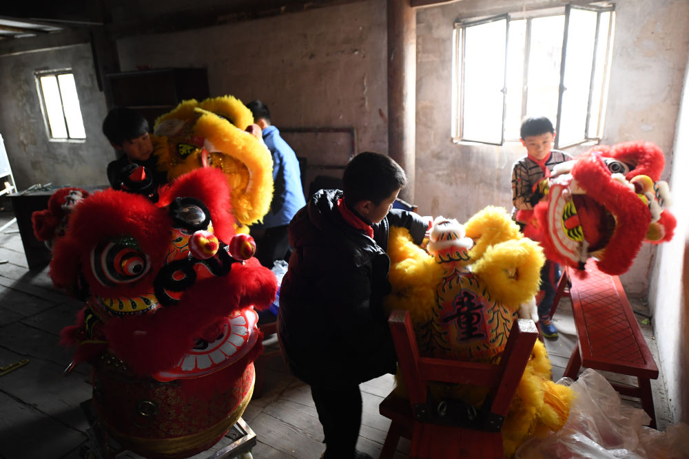 ↑1月21日,在前童古镇祠堂,古镇舞狮队在训练。
