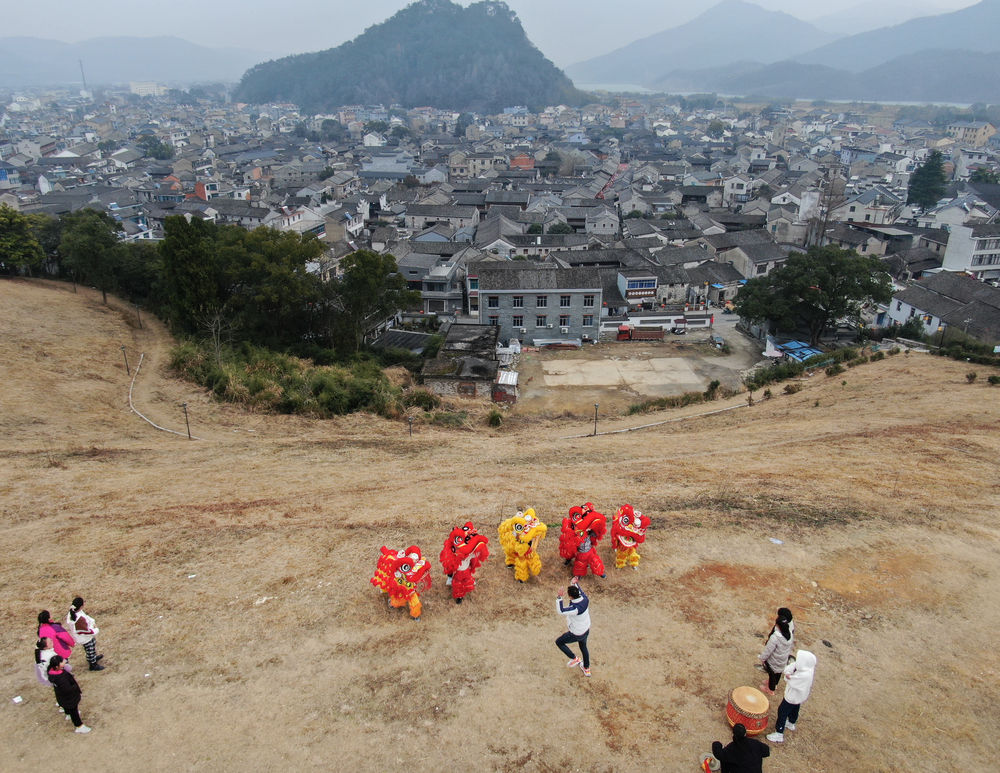 ↑1月20日,在前童古镇边的小山上,童攀峰带领舞狮队进行训练(无人机照片)。