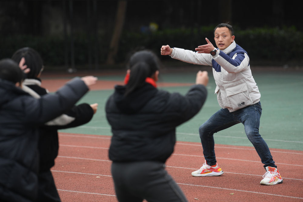 ↑1月21日,在前童镇中心小学,童攀峰带领学生们开展舞狮基本动作训练。