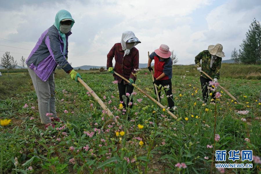 农民在宁夏西吉县的艾草种植基地劳作(2018年8月30日摄)。新华社记者 王鹏 摄