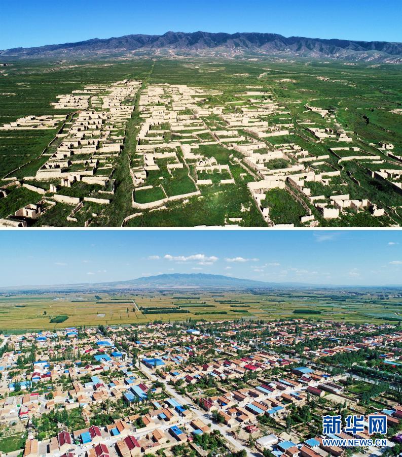 这是一张拼版照片,上图为:经过多年的生态修复,宁夏吴忠市红寺堡区新庄集乡的移民旧址已逐渐被绿色覆盖;下图为:戈壁荒滩上建起的红寺堡移民新村(2018年9月8日摄,无人机照片)。新华社记者 王鹏 摄