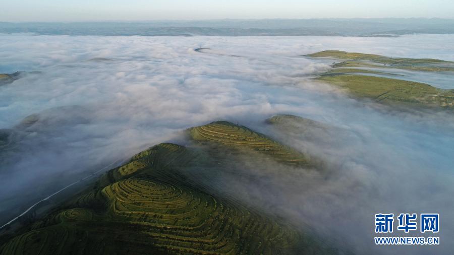 这是2018年7月17日拍摄的云雾缭绕的宁夏彭阳县金鸡坪梯田公园(无人机照片)。新华社记者 王鹏 摄