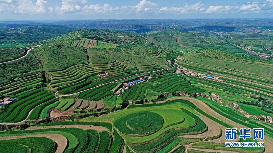 这是2018年7月16日拍摄的宁夏彭阳县金鸡坪梯田公园(无人机照片)。新华社记者 王鹏 摄