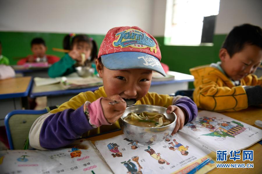 宁夏西吉县震湖乡陈岔小学的孩子在教室吃午餐,学生每天在学校有两顿国家提供补助的营养餐(2017年6月14日摄)。新华社记者 王鹏 摄