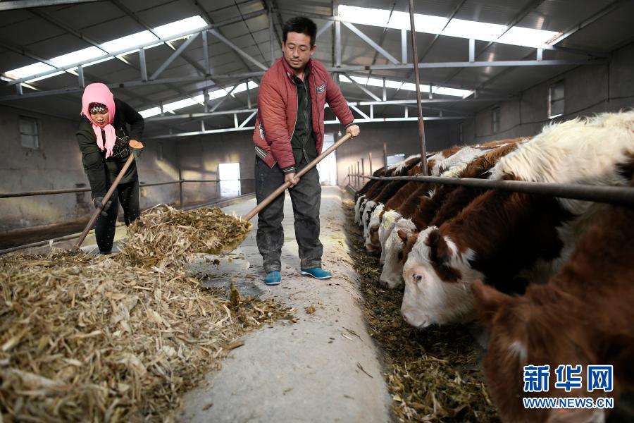 宁夏吴忠市同心县河西镇旱天岭村村民马国才(右)、马婷夫妇在村里的养牛合作社喂牛(2017年12月21日摄)。新华社记者 王鹏 摄