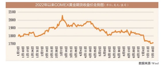 “随着美国通胀数据连创阶段新高,压制通胀的急切性使得市场对美联储紧缩政策的预期不断升温,在6月美国通胀数据公布之后,市场一度大幅押注7月美联储将加息100个基点。”中信建投期货贵金属分析师王彦青表示,在这种不断强化的市场预期下,利率抬升的估值压力加上短期内快速走强的美元指数对黄金价格形成明显利空效应,导致金价下跌。